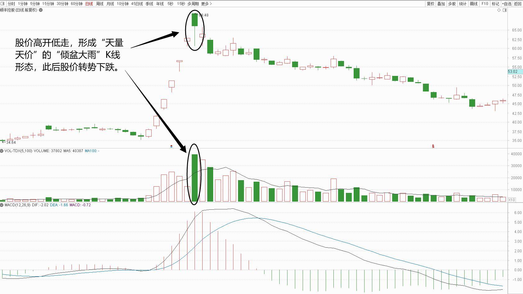 常言道“天量见天价”,所谓“天量”是指某时间段内(如日或周)成交量达到近期最大量;“天价”则是指同一时期内股价创出阶段新高。这种现象通常表明主力正在进行大规模筹码派发,也意味着股价可能面临急转直下的风险。如果不能及时止损或离场,投资者可能将之前的盈利悉数回吐。